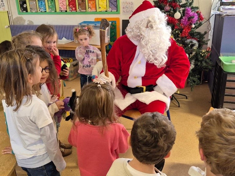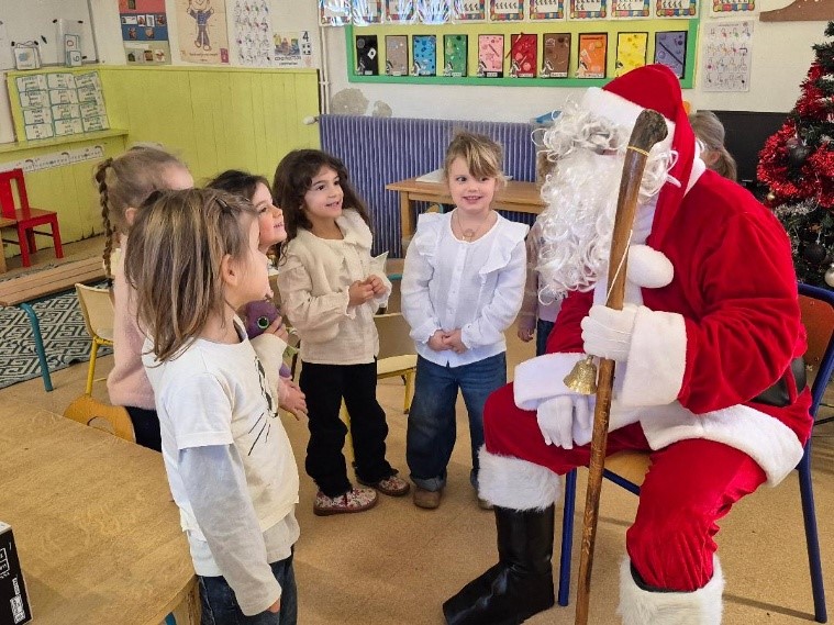 Le Père Noël en personne a fait une halte dans la classe pour le plus grand bonheur des enfants. Sourires émerveillés et yeux pétillants étaient au rendez-vous lorsqu’il a distribué de nouveaux jeux destinés à la classe. Pour compléter cette visite féerique, chaque enfant a également reçu une mandarine et des papillotes, ajoutant une touche gourmande à cette journée déjà inoubliable.