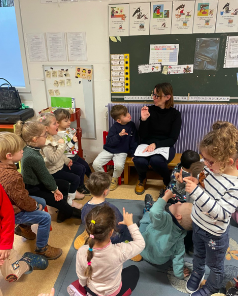 regroupement, une initiation à la langue des signes. Aidés par Véronique et Annabelle, enseignante et éducatrice